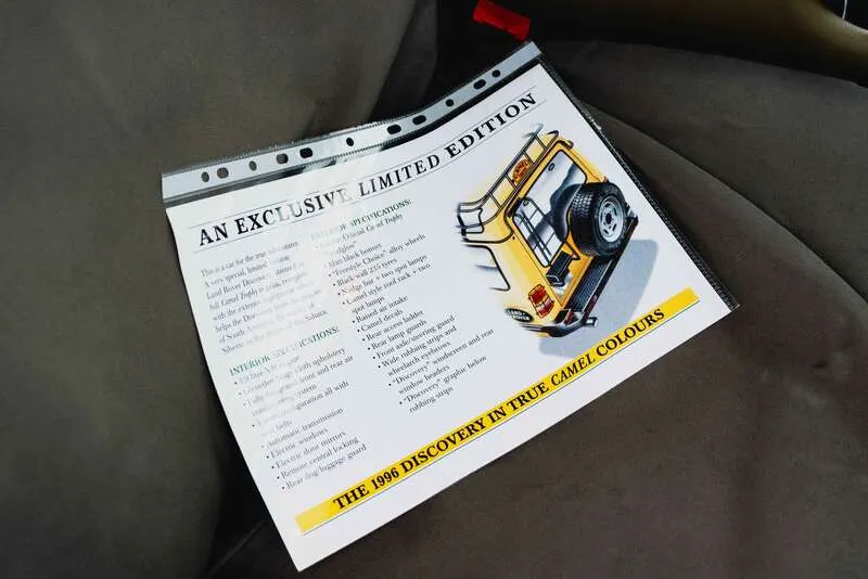 This lot will be auctioned via Iconic Auctioneers, The Classic Sale at the Practical Classics Classic Car and Restoration Show 2026 on Saturday the 21st of March - Sunday the 22nd of March, NEC, Birmingham, B40 1NT. The Discovery 300Tdi Camel Trophy Limited Edition was produced, featuring a distinctive specification and now regarded as one of the more collectible Discovery variants Originally intended for a special order to Japan as a training vehicle for Camel Trophy competitors before the order was cancelled, subsequently sold through a Land Rover dealer, and maintained by Gigglepin for many years before undergoing a thorough restoration in late 2024 Finished in Camel Trophy-style livery with the correct expedition inspired exterior details and trim. The seats have been replaced and are correct for the model with the driver’s seat trimmed in leather Powered by the proven 300Tdi 2.5-litre (2495cc) inline 4-cylinder, direct-injection, turbocharged, 112bhp diesel engine paired with a manual gearbox and permanent four-wheel drive, offering dependable performance and strong off-road capability Equipped with a range of Camel Trophy themed features as specified by Land Rover Special Vehicles, distinguishing it from standard Discovery models Supplied with a fresh MOT prior to sale, restoration photos,  and relevant paperwork Not an event car and never used in a Camel Trophy competition, this is a rare opportunity to acquire a well presented and authentically specified Camel Trophy Limited Edition Discovery with appealing history and usability. 2.5-litre (2495cc) inline 4-cylinder, direct-injection, turbocharged diesel engine.