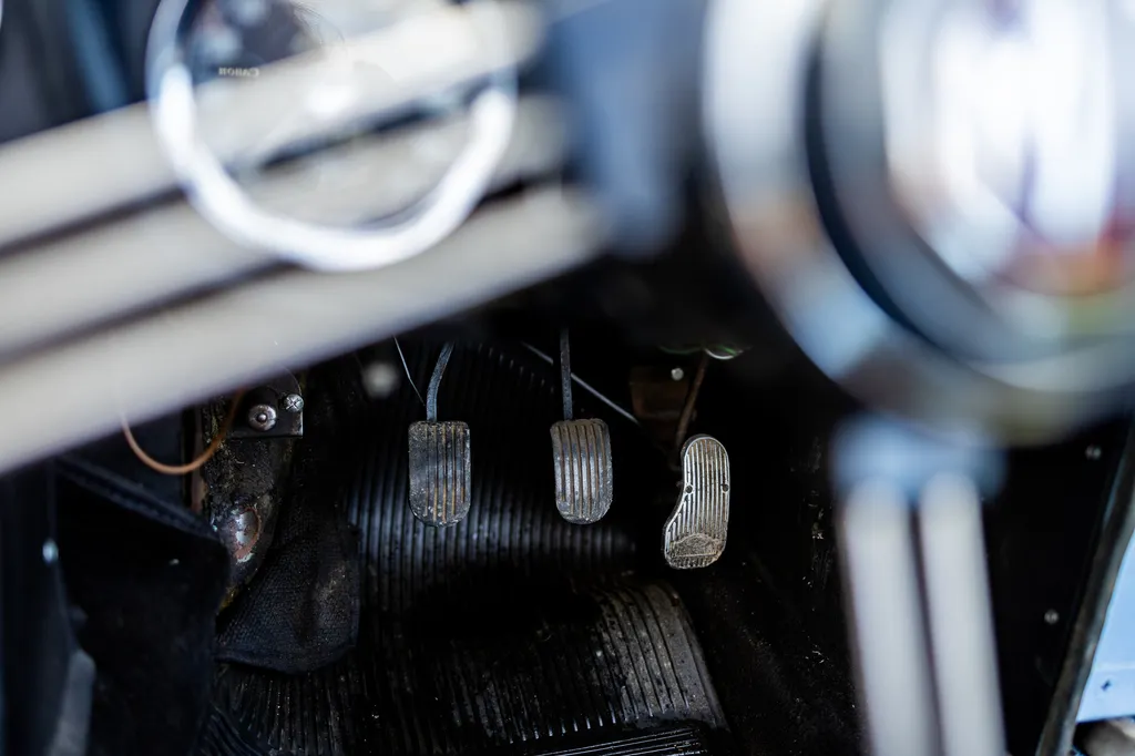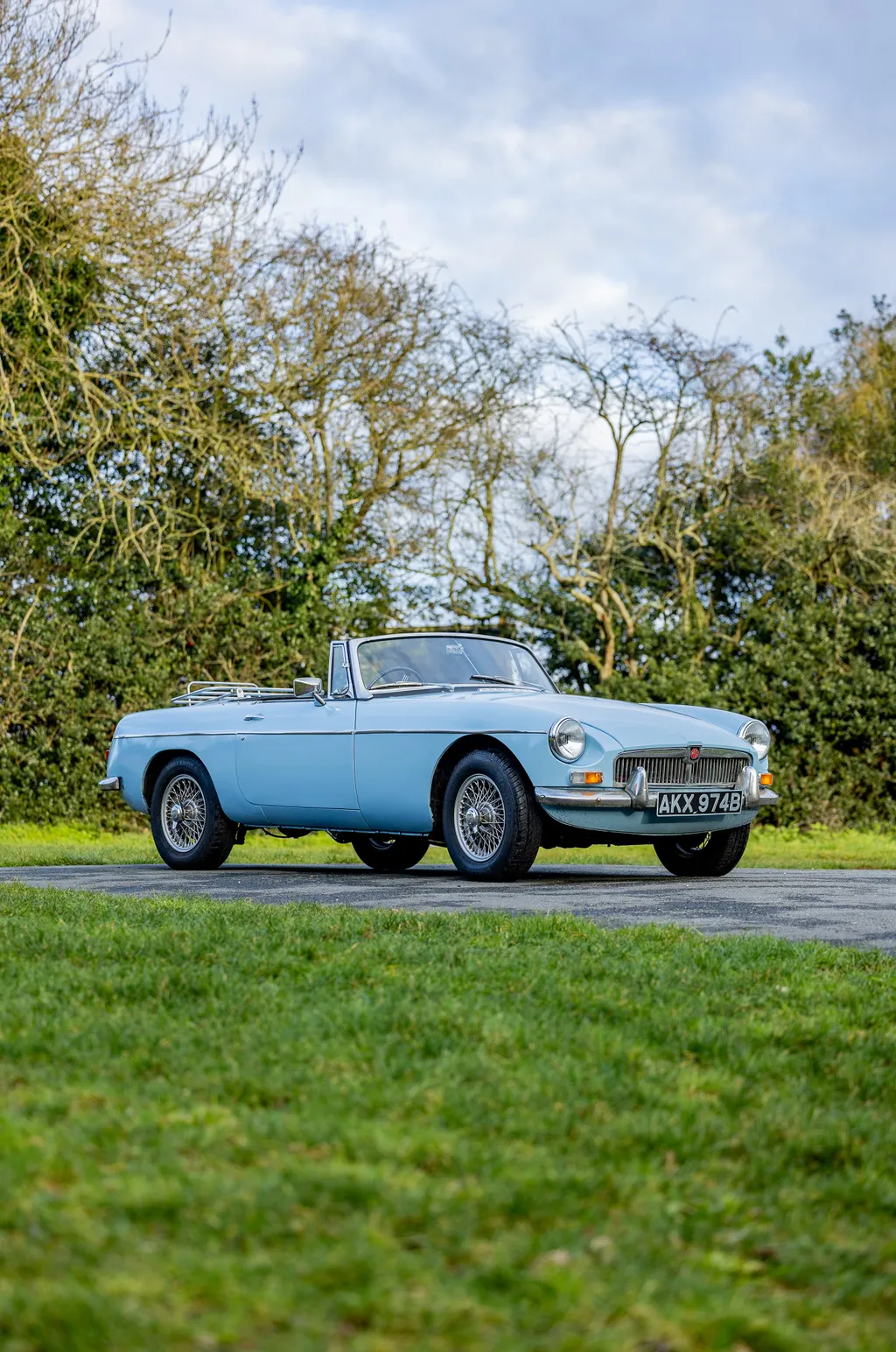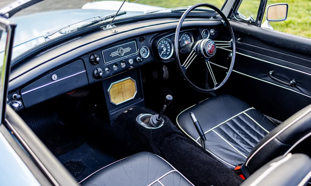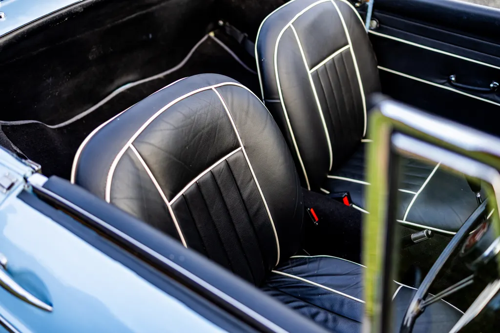 This very original, three-owners-from-new example, is presented in Iris Blue, its original colour, and has a black leather interior. The seats have been retrimmed with white piping in circa 2017 when the current owner purchased the car from a 38-year previous ownership. It comes with a black hood, and a stainless steel fitted luggage rack on the rear boot lid. Being an early MGB, it is powered by the preferable and rare three-bearing 1,798 cc B-Series engine, which sounds great! It sits on wire wheels which are in good condition and interestingly, this example comes with its original buff logbook confirming that the chassis and engine are indeed original from factory. Much work has been carried out to this great British classic (full list in the history file) which includes two new front and rear inner wings, two front and rear wings, two new sills, new rear springs, fuel tank, new windscreen and quarter lights, new tyres/wheels and new radiator, to name a few items, resulting in a sound car mechanically and one that drives well according to our vendor, who has covered minimum mileage since work was carried out. This is certainly a MGB which can be used regularly and still brings a smile to your face. Consigned by James Good